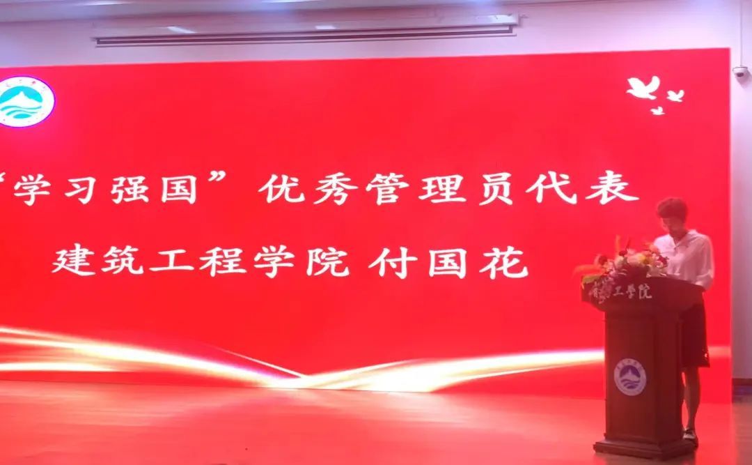 公司团总支书记付国花作为"学习强国"优秀管理员代表讲话:公司高度重视“学习强国”平台的推广与学习工作,将“学习强国”学习平台作为党员师生理论武装的“加油站”,通过精心组织、周密安排、全面推进“学习强国”平台使用推广,着力打造“学习强院”。