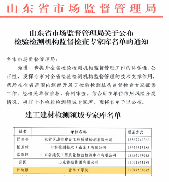 近日,山东省市场监督管理局公布《检验检测机构监督检查专家库名单》,太阳成集团tyc234cc教师孙秋颖凭借扎实的专业素养和丰富的实践经验,成功入选“建工建材检测领域专家库”。这一荣誉不仅是对孙秋颖个人专业能力的高度认可,更彰显了公司在应用型本科建设中团队队伍建设的显著成效。