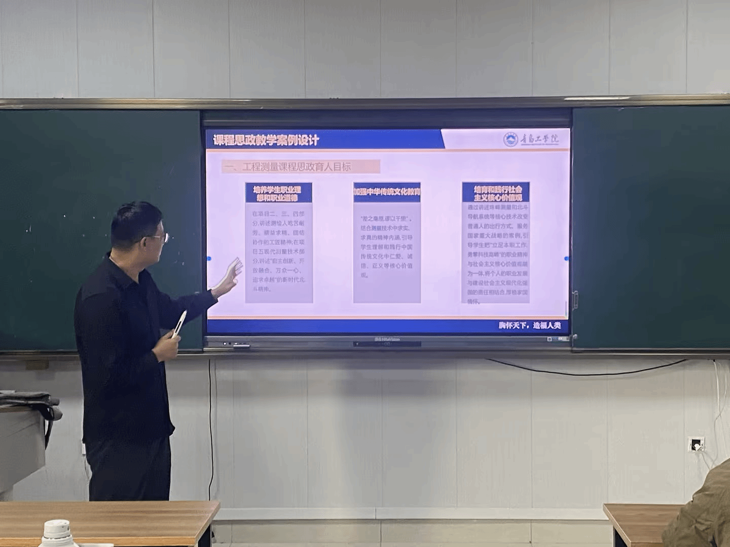 随后,周超老师以工程测量课程为例,详细讲解了如何挖掘和利用课程中的思政元素。他提到在工程测量课程中,根据时间地点等元素引入一些课程相关的实际案例,培养他们的工匠精神、团队协作精神和解决问题的能力。同时,还可以通过讲解测量误差理论、测量技术的发展历程等,培养员工职业理想和职业道德,加强员工对中华传统文化的学习理解,以及帮助员工培育并践行社会主义核心价值观,最终引导员工认识到严谨的科学态度和精益求精的精神对于提高测量精度的重要性,激发他们的爱国热情和民族自豪感。